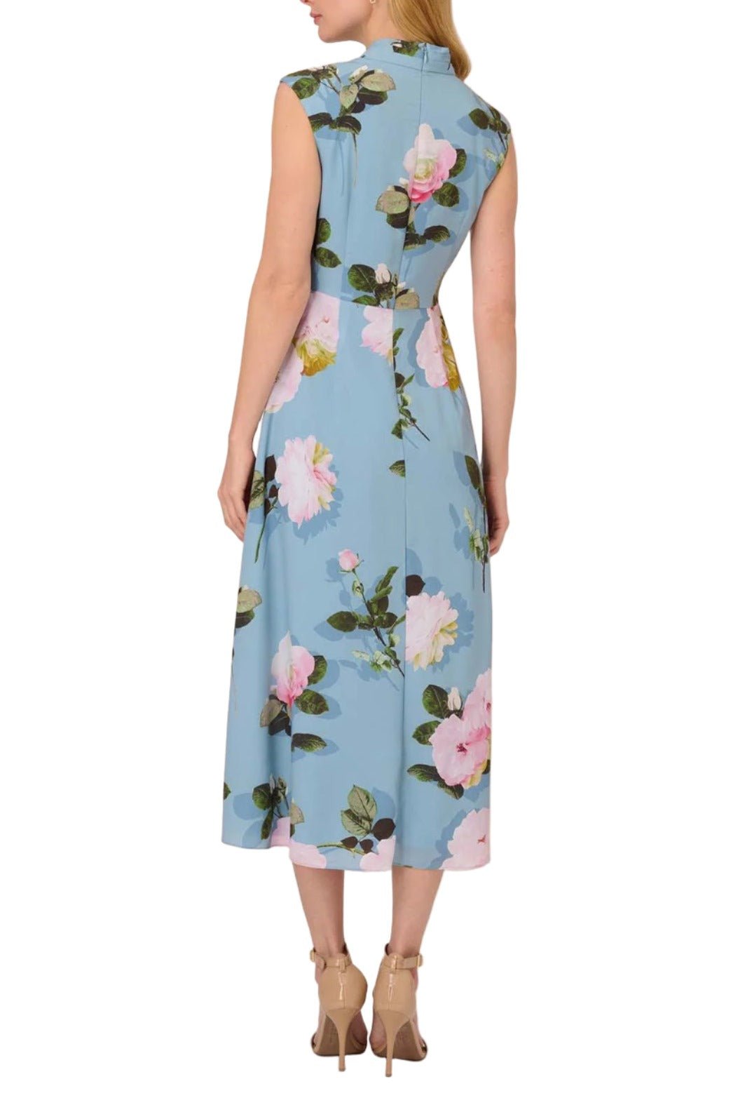 Indulge in luxury with the Adrianna Papell Tie Neck Sleeveless Dress. Featuring a delicate floral print. a chic tie neck. and a zipper back closure. this crepe dress exudes elegance and sophistication. With a slit side design. it adds a touch of sensual allure to your wardrobe.